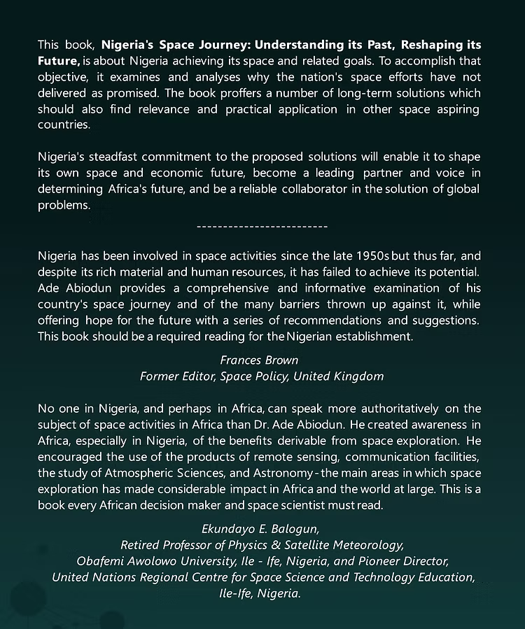 Nigeria’s Space Journey – Understanding its Past, Reshaping its Future is about space and its impact on a developing country, with Nigeria as a case study. The book focuses on the steps Nigeria is taking to achieve its space and related goals; it is divided into six main sections: Space in Human Lives; Space Efforts in Nigeria; Reawakening of Nigeria; Nigeria’s Space Priorities; Contributions to the Resolution of Global Concerns; and Moving Ahead.